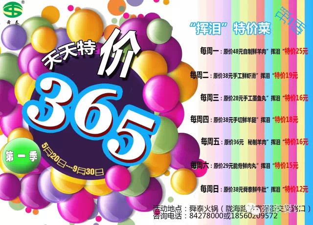 A、特價(jià)菜活動(dòng)說(shuō)明:舜泰火鍋每天推出一道“揮淚”特價(jià)菜,每桌限點(diǎn)一份,具體如下:
